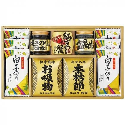 ●商品内容/鰹本枯れ節(2.5g×2)・松茸風味お吸い物(2.3g×3)×各1、焼きのり佃煮85g・塩昆布18g×各1、白子のり味のり(8切×5)×6、紅ずわいがにほぐし身55g×1