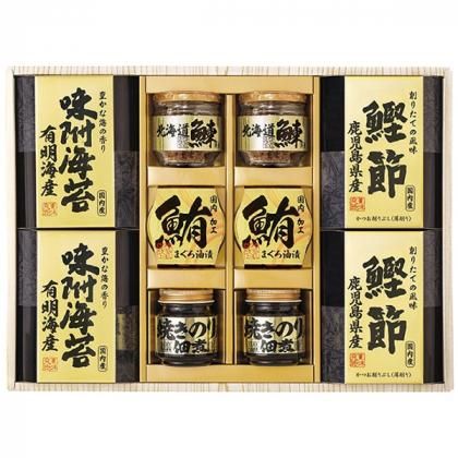 北海道産の鰊フレーク、小豆島で製造された焼き海苔入りの佃煮、鹿児島県産鰹節など選りすぐりの逸品を詰め合わせた和風ギフトです。