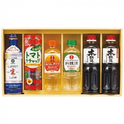 ●商品内容/キッコーマンいつでも新鮮しぼりたて生しょうゆ450ml・イカリなめらかトマトケチャップ280g・日の出料理酒400ml・日の出割烹みりんタイプ400ml×各1、サンビシ本醸造しょうゆ500ml×2