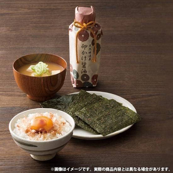昔ながらの天然蔵でじっくりと熟成し作られたお醤油と、味付け海苔や鰹節などをセットにした日本の心が感じられるギフトセットです。