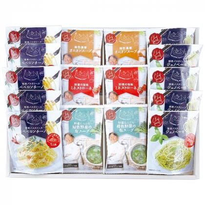●商品内容/オニオンスープ・ミネストローネ・緑色野菜の塩スープ×各2、粉末パスタソース(ジェノベーゼ、ペペロンチーノ)×各5