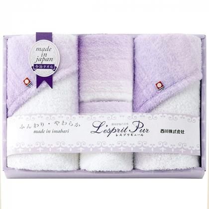 フランス語で「清らかなこころ」を意味する、レスプリピュール。純真な想いからくる清らかな心のイメージを清楚なパープルのグラデーションカラーを使って、ふんわりとやわらかなタオルギフトにしました。日本のタオルの産地「今治」で丁寧に織り上げられた吸水性の高いタオルです。