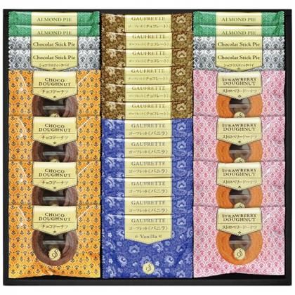 風味豊かなバニラクリームをサンドしたバニラゴーフレットや、上品な味わいに仕上げたチョコゴーフレット、何層にも重ねたパイ生地に細かく砕いたアーモンドを挟み、サックリと焼き上げたアーモンドパイ、チョコをサンドしたやさしい甘さのショコラスティックパイに、チョコとストロベリーの焼ドーナツをセットしました。お菓子好きな人にも満足な詰め合わせです。